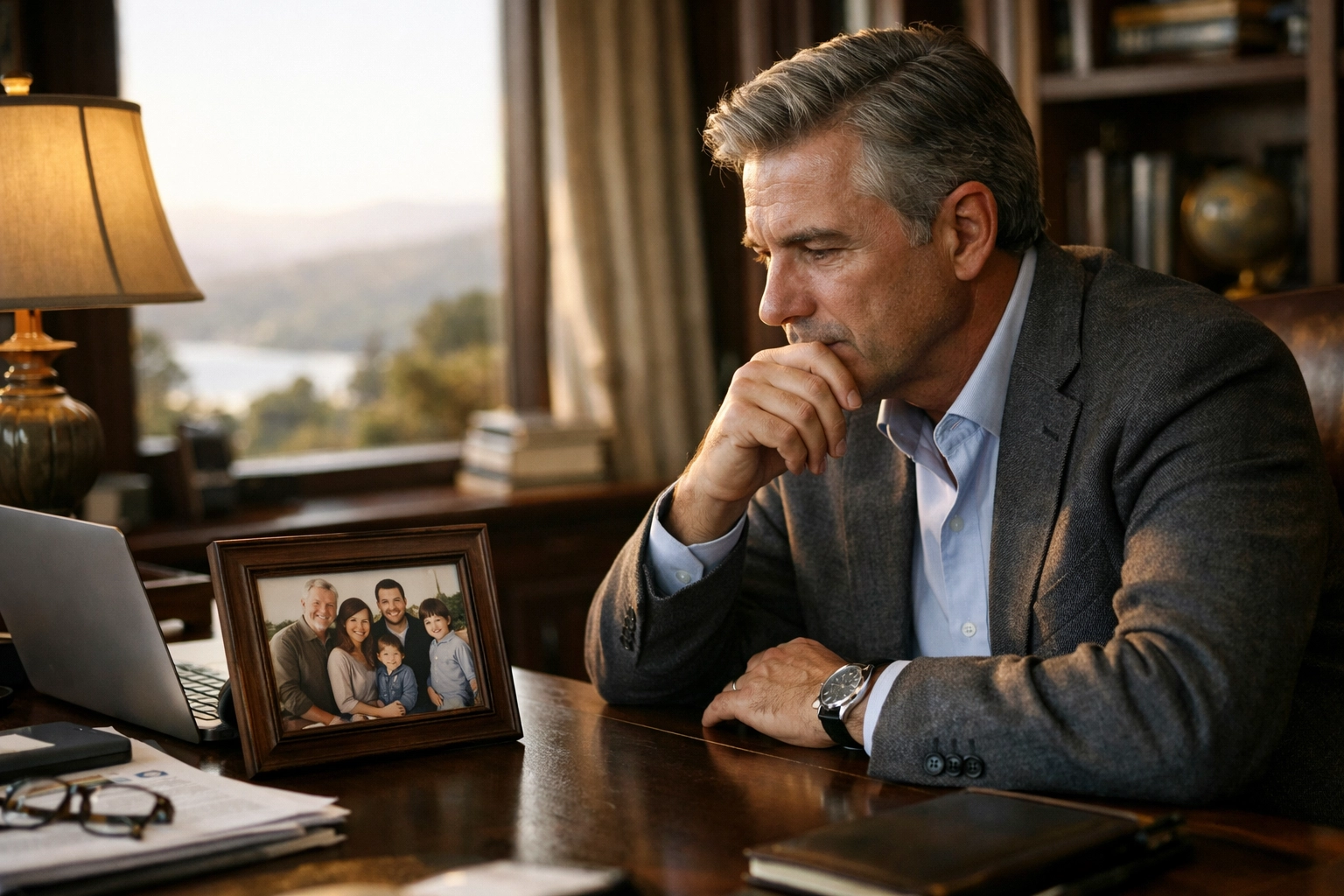 ![A successful executive reviews legacy and care planning at home]